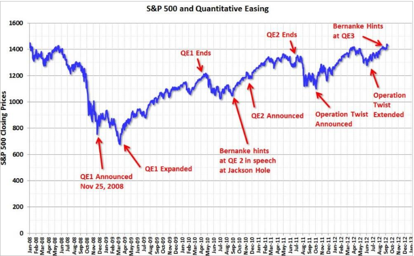 El enjuague de la expansión cuantitativa sí ha tenido un impacto positivo en Wall Street. Lo vemos en la evolución del S&P 500, que desde 2008 hasta hoy se ha movido hacia arriba en tiempos de estímulo monetario y hacia abajo en los momentos de repliegue o pausa de estas medidas.