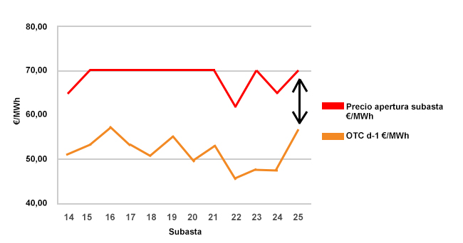 Sin ir más lejos, los agentes que participaron en la subasta previa (24ª) perdieron dinero -precio base superior al subastado, como se ve en el gráfico-. Estas pérdidas, sumadas a las "inciertas" expectativas de beneficios que podrían obtener en la subasta de diciembre, "podría haber afectado tanto al nivel de participación en la 25ª Cesur, como a las mayores retiradas de volumen en dicha subasta", según explica la propia CNMC en su informe. Efectivamente, la oferta inicial fue un 11% inferior al de otras subastas similares.