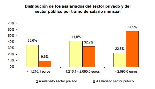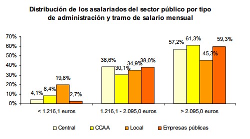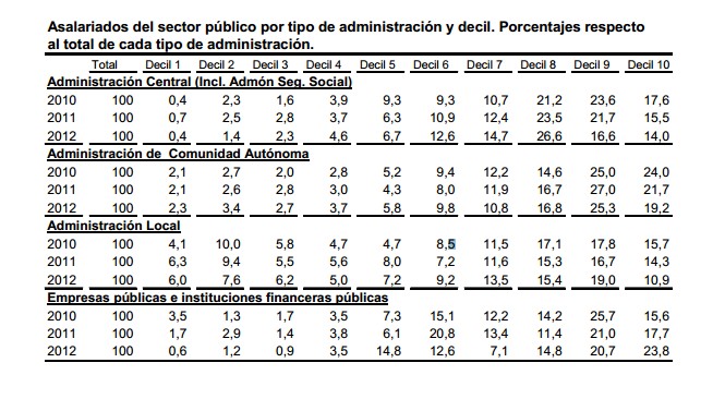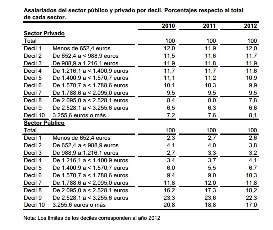 A pesar de la crisis, el sector público español sigue siendo bastante más generoso con sus empleados que el privado. Según el informe Decil de salarios de la EPA de 2012 publicado por el INE, el 57,5% de los asalariados del sector público (1,8 millones) tuvo un salario bruto mensual superior a 2.095 euros en 2012. En el caso de los empleados del sector privado, sin embargo, sólo el 22,5% alcanzó dicha cuantía.