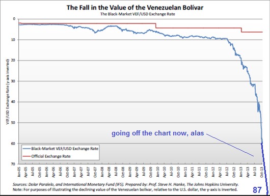 La desconfianza hacia su moneda es total. Nadie quiere bolívares. Los venezolanos sólo buscan dólares, euros o bien oro. El valor del bolívar no encuentra suelo: el tipo de cambio oficial es de 6,3 bolívares por dólar y de 11,36 para los turistas extranjeros, pero su cambio real en el mercado negro ronda ya los 90 bolívares por dólar.