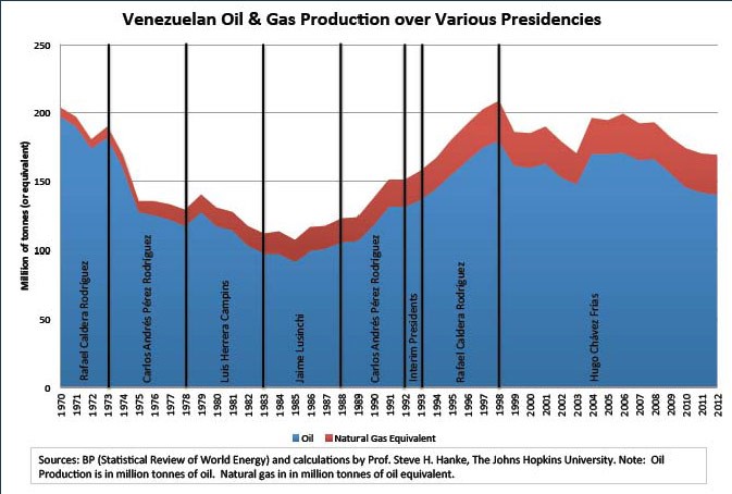 Otra prueba evidente de la ruina chavista es la producción de petróleo. Venezuela posee una de las mayores reservas de crudo y gas del mundo, pero la nacionalización de esta industria ha convertido a este país en el único poseedor importante de recursos energéticos cuya producción ha caído en el último cuarto de siglo.