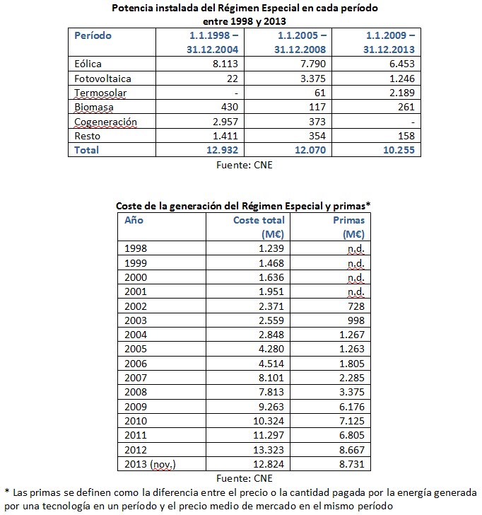 El Real Decreto 2366/1994 de 9 de diciembre creaba el llamado desde entonces Régimen Especial, que incluía las tecnologías renovables no hidráulicas (eólica, solar, mareomotriz, geotérmica y otras), los residuos sólidos urbanos, los residuos industriales, la biomasa y la cogeneración, las instalaciones que utilicen calores residuales de otros procesos, todas siempre que la potencia de la instalación no supere los 100 MVA, y las hidroeléctricas de potencia inferior a 10 MVA. El RD establecía el régimen económico para la energía generada mediante esas tecnologías.