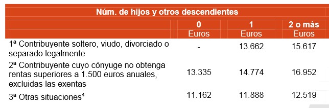 Entre otras medidas, la citada reforma incluirá un aumento "significativo", según Rajoy, de los mínimos personales por hijos y para ascendientes y discapacitados dependientes de la unidad familiar. Actualmente, el mínimo personal en el IRPF es de 5.151 euros, que se incrementa en 918 euros para los mayores de 65 años y en otros 1.122 euros cuando se tienen más de 75 años. Por su parte, los mínimos por descendientes menores de 25 años o discapacitados van entre los 1.836 euros para el primer hijo hasta los 4.182 euros para el cuarto hijo y siguientes.