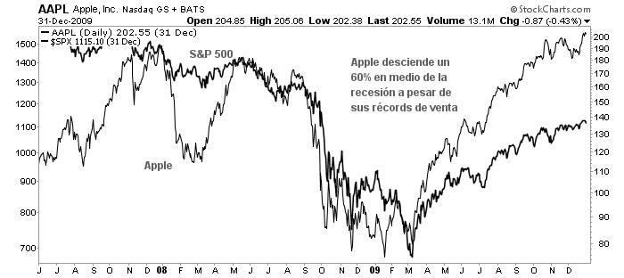 Quinto, la enorme mayoría de los inversores desconoce en qué fase del ciclo económico nos encontramos y cómo analizarlo. No es de extrañar que con esta carencia de conocimiento muchas de sus compras se produzcan en el peor momento. La realidad es que cuando la marea sube hasta los peores valores ascienden en bolsa y cuando la marea desciende incluso las compañías más rompedoras caen en picado. Un ejemplo es la maravillosa compañía de los iPhone, Apple Incorporation que sufrió un descenso del 60% entre 2007 y 2009 sólo porque la economía norteamericana sufría una recesión. Es fundamental, si un inversor espera llegar a buen puerto, conocer en qué momento del ciclo nos encontramos y cómo cada fase económica afecta a las cotizaciones.