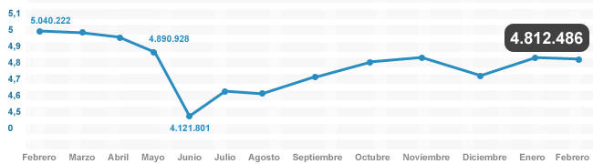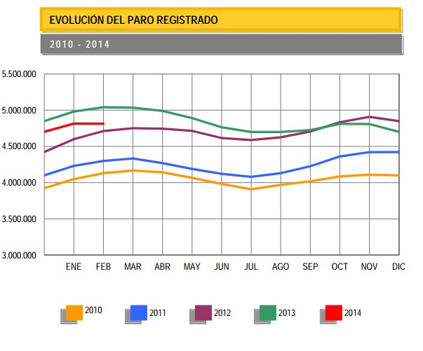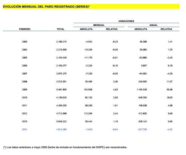 Si nos remontamos a febrero del año pasado, el desempleo subió en 59.444 personas y superó la cifra récord de los 5 millones de parados. En concreto, en febrero de 2013 se llegaron a alcanzar los 5.040.222 de parados, el nivel más alto en toda la serie histórica comparable, que arranca en 1996.