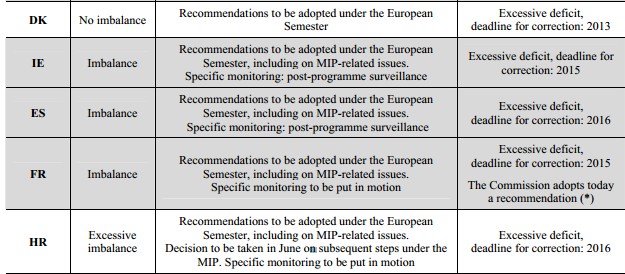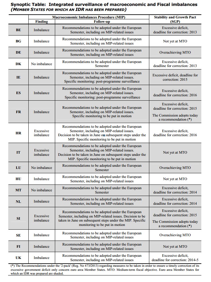 La Comisión Europea considera que 14 Estados miembros están experimentando actualmente desequilibrios: Bélgica, Bulgaria, Alemania, Irlanda, España, Francia, Croacia, Italia, Hungría, el Países Bajos, Eslovenia, Finlandia, Suecia, y el Reino Unido. Sin embargo, en Croacia, Italia y Eslovenia, estos desequilibrios son considerados excesivos.