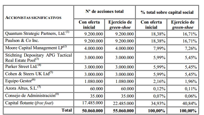 George Soros, que ocupa el puesto número 26 de la última lista Forbes de los más ricos del mundo, realizará la operación a través de su fondo Quantum Strategic Partners y John Paulson, en el puesto 76, lo hará a través de su firma Paulson & Co. Pero éstos no serán los únicos accionistas extranjeros de la inmobiliaria. El hedge fund Moore Capital Management, propiedad de Louis Bacon, invertirá 40 millones de dólares, el fondo de pensiones holandés APG, 30 millones y las estadounidenses Cohen & Steers y Canepa, otros 30 cada una. El capital que queda será free float y se negociará en el mercado.