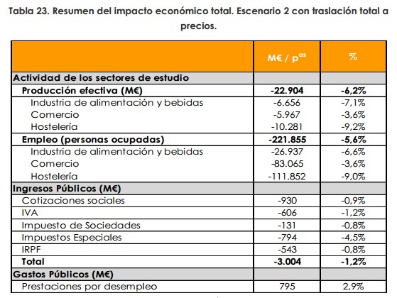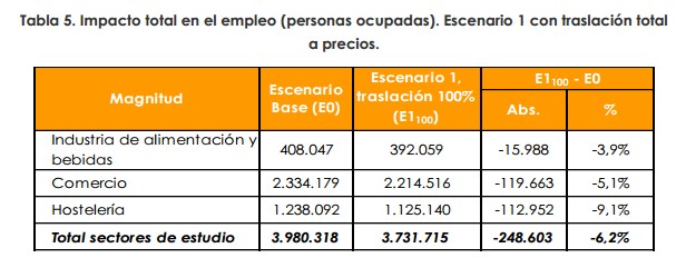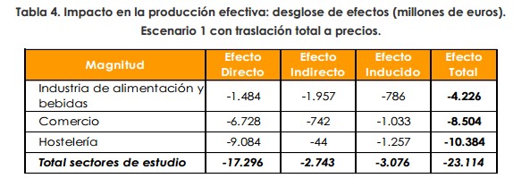 Este retroceso, según el informe, sería especialmente profundo en el sector de la hostelería que actualmente soporta el tipo reducido (10%) de IVA. En segundo lugar se sitúa el impacto en la producción de la industria de alimentación y bebidas, del 7,1% (6.656 millones de euros). Por su parte, el sector comercio, que es el más significativo entre los sectores de estudio, experimenta una caída del 3,6% en su producción, 5.967 millones de euros en términos absolutos.
