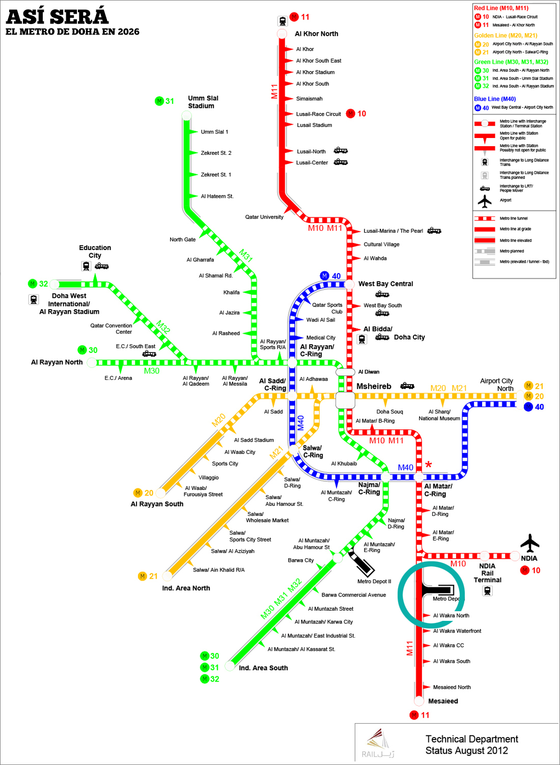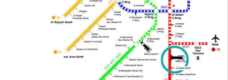 Se trata de un tramo de 6,96 kilómetros de longitud de metro elevado por el que se levantarán 3 estaciones: Barwa Village, Al Wakra North y Qatar Economic Son. La obra de FCC (rodeada en el plano que se muestra a continuación) está situada al sur de la ciudad en un enclave estratégico muy próximo al aeropuerto de la capital Qatarí, según ha podido saber Libre Mercado.