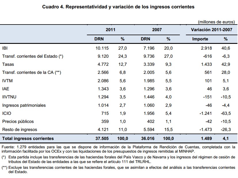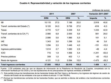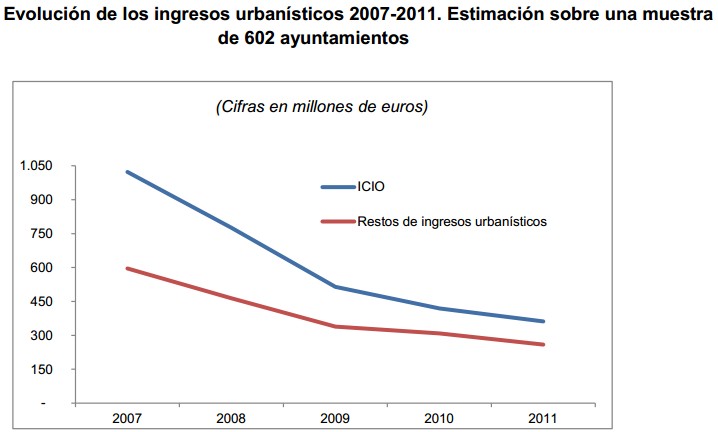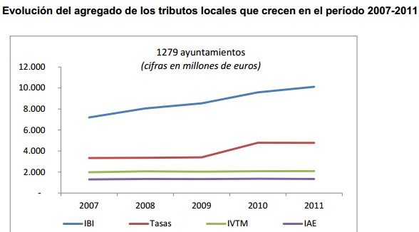 Sin embargo, los ayuntamientos compensaron estas caídas mediante un "aumento muy significativo" del IBI (+46%) y de los ingresos por tasas (+42,9%), cuya recaudación se incrementó en 4.352 millones de euros entre 2007 y 2011. Así pues, la Administración Local trasladó la presión fiscal del sector de la contrucción a los propietarios de vivienda y los usuarios de servicios municipales (basuras , agua, etc.), cuyas vías de escape son mucho más limitadas. Mientras, otros tributos locales, como es el caso del Impuesto sobre Actividades Económicas (IAE) y sobre vehículos (IVTM), se mantuvieron estancados.