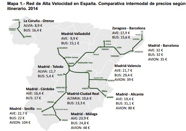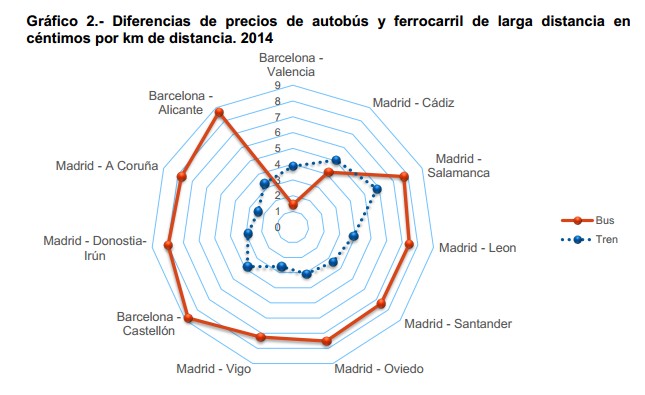 La competencia más agresiva se localiza en las rutas que unen Madrid con Valladolid, A Coruña con Orense y Madrid con las provincias levantinas. Las diferencias tarifarias en estas últimas pueden llegar a ser de 8 euros en el caso de Valencia y de casi 12 euros en la ruta de Alicante. De hecho, entre los casos analizados, que prácticamente cubren la totalidad de la red nacional, la única excepción en la que el precio del AVE es superior al precio del autobús es la relación Zaragoza-Barcelona, donde el autobús es aproximadamente 1,5 euros más barato.