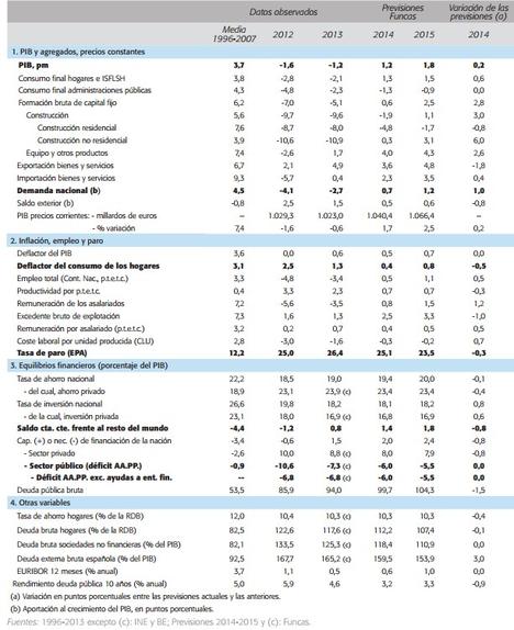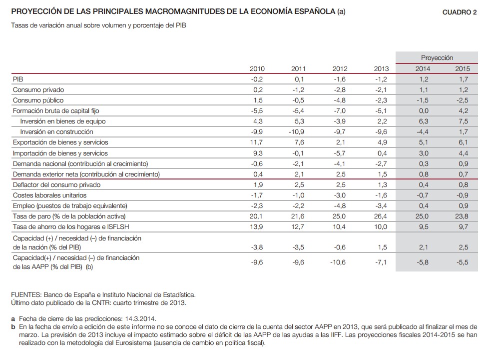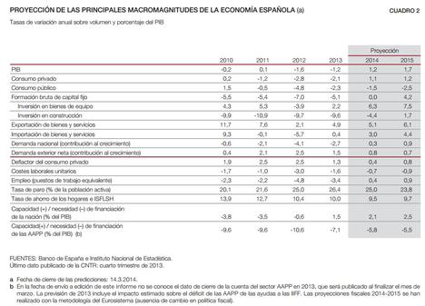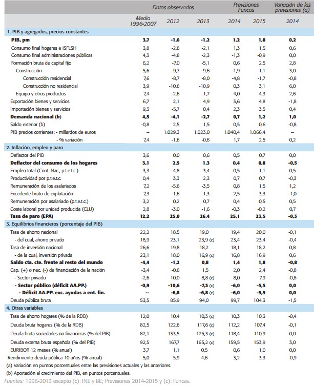 Tras abandonar la recesión a mediados del pasado año, el BdE espera que el avance de la economía española prosiga a lo largo del presente ejercicio. En concreto, estima que el PIB aumentará un 1,2% en 2014, lo cual constituye la primera tasa positiva tras el 0,1% de 2011 y la más elevada desde el estallido de la crisis. Mientras, para 2015 avanza un crecimiento del 1,7%. Funcas, por su parte, prevé un 1,2% y un 1,8%, respectivamente.