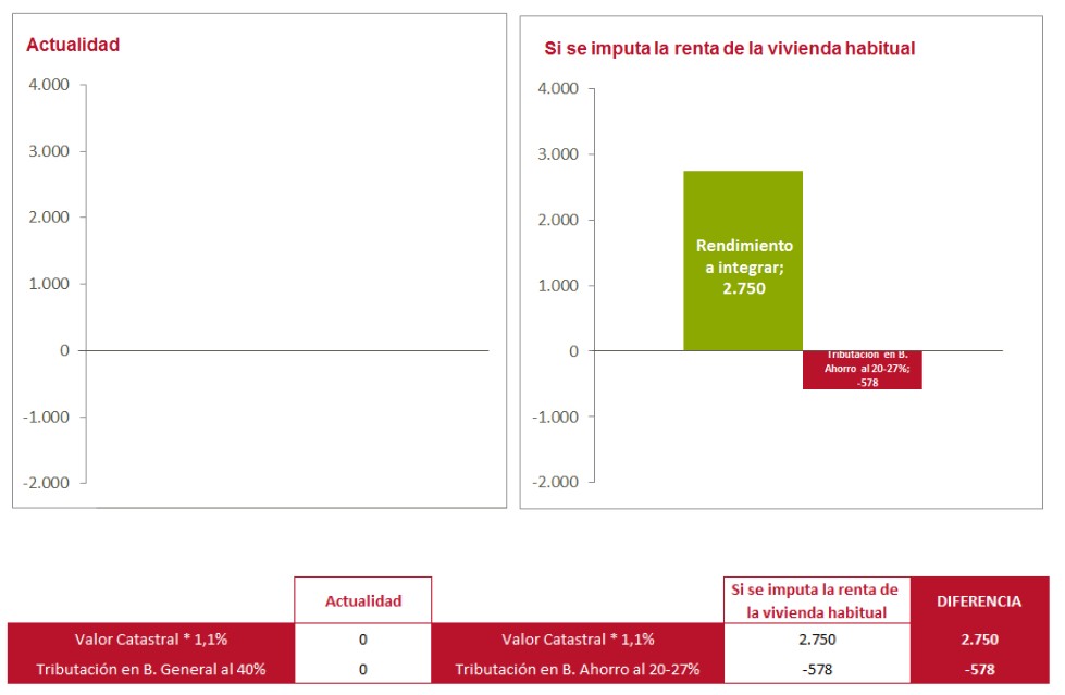 El resultado sería una factura de 578 euros al año en el IRPF, consecuencia de imputar una renta ficticia del 1,1% sobre el valor catastral de la vivienda habitual, al que se aplicaría un tipo fiscal de entre el 20% y el 27%.