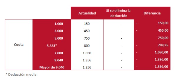 Supongamos un inversor que tiene una hipoteca sobre su vivienda habitual comprada antes de 2013 de 15.000 euros. En la actualidad se deduce anualmente el 15% de 9.040 euros (máximo), es decir 1.356 euros anuales. En caso de eliminar dicha deducción, el inversor no podría deducirse nada, perjudicándole anualmente en 1.356 euros.