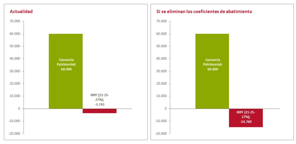 La primera consistiría en elimina los coeficientes de abatimiento. Tal y como advierten los asesores de Abante, en la actualidad, existe cierto beneficio fiscal si se transmiten elementos patrimoniales (acciones, fondos e inmuebles, entre otros) adquiridos antes del 31 de diciembre de 1994. "La ganancia patrimonial generada puede verse reducida considerablemente. El coeficiente de abatimiento depende del tipo de activo y del momento de la compra". Y, para ello, ponen el siguiente ejemplo con la venta de acciones, aunque el impacto sería similar en caso de la venta de un inmueble adquirido antes de finales del 94: