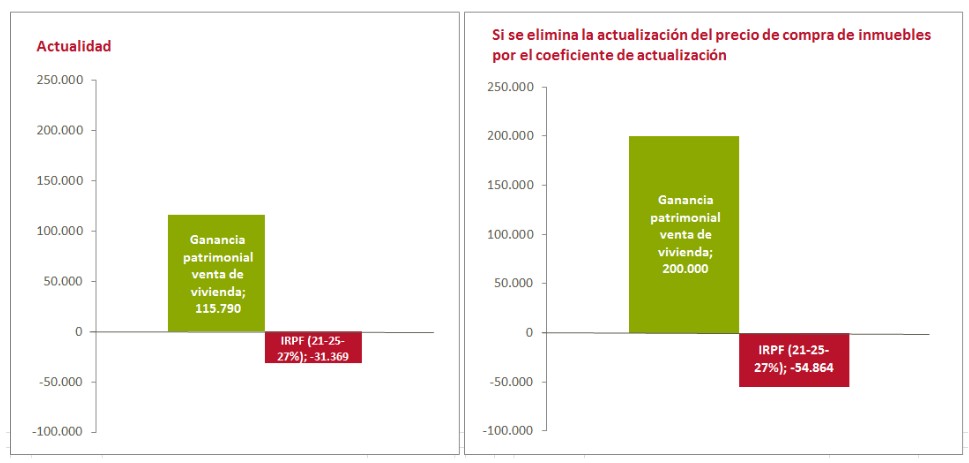La segunda medida tiene que ver con la supresión de la actualización del precio de compra de bienes inmuebles. En la actualidad, al calcular la ganancia generada por la venta de un inmueble, se tiene en cuenta el año de compra del inmueble y se actualiza el valor de compra por un coeficiente de actualización que trata de paliar el efecto de la inflación. Su eliminación "perjudicaría a los contribuyentes, ya que el precio de compra sería inferior y la ganancia patrimonial mayor, teniendo que pagar más impuestos a Haciendapor la operación", aclaran los asesores. ¿Ejemplo?