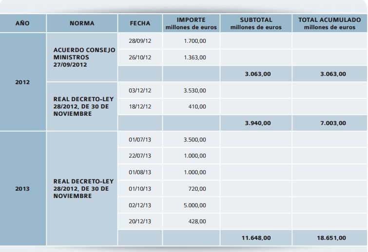 rnrnLas disposiciones del Fondo realizadas desde septiembre de 2012 hasta cierre de 2013 ascienden a un total de 18.651 millones de euros: 7.003 millones en 2012 y los 11.648 millones restantes en 2013, tal y como refleja el siguiente cuadro.