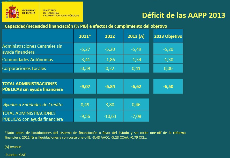 Desglosando las cifras del déficit público, la Administración Central del Estado y la Seguridad Social cerraron 2013 con un déficit del 5,49% del PIB, frente al objetivo del 5,2%, mientras que las comunidades autónomas tuvieron un déficit del 1,54% del PIB, también por encima del objetivo del 1,3%. Los únicos que cumplieron fueron los ayuntamientos, que consiguieron un superávit del 0,41% del PIB, mejorando el equilibrio previsto, y que compensaron los incumplimientos de las demás administraciones.