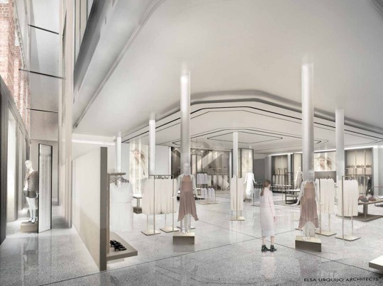 Para unificar pasado y presente, tradición y moda, el proyecto arquitectónico ha mantenido intacta la fachada e ladrillo y balcones de forja, creando en el interior una caja de cristal totalmente independiente en la que se despliegan las propuestas de moda.