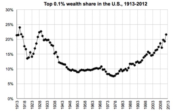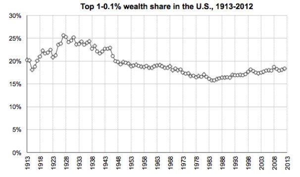 De entrada, Saez y Zucman apuntan que el nivel de riqueza del 0,1% más acaudalado fue a menos entre los años 30 y 70 del siglo pasado. Sin embargo, desde la década de los 80 hasta hoy, la cuota de la riqueza nacional que manejan estas grandes fortunas ha subido del 10% al 20%.
