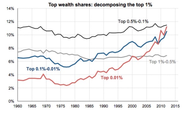 Desde 1960 hasta hoy, la riqueza del 1% más rico se mantuvo constante. Incluso acotando el campo de estudio al 0,5% de más ingresos, vemos que la tendencia fue estable. El gran salto adelante lo encontramos solamente entre el 0,1% más próspero.