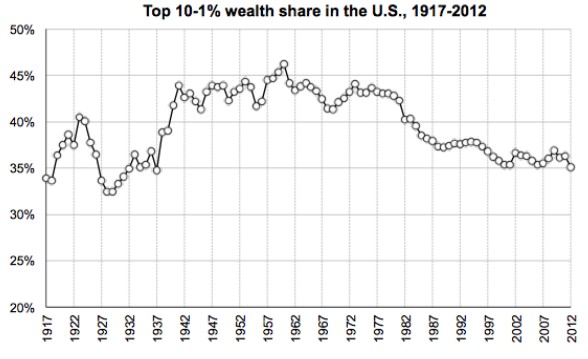 De igual modo, si nos centramos en el 1% más rico, pero excluimos al 0,1% de mayor fortuna, encontramos que su cuota de la riqueza nacional se ha mantenido estable en los últimos cincuenta años, experimentando una tendencia decreciente hasta los 80 y aumentando desde entonces hasta llegar ahora a niveles similares a los de 1964.
