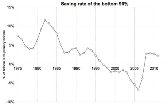 ¿Y qué hay del 90% restante? De acuerdo con Saez y Zucman, la principal razón por la que su riqueza no ha crecido en los tres últimos lustros ha sido la falta de ahorro. Ambos economistas denuncian que en los años previos a la crisis, el exceso de endeudamiento se unió a tasas negativas de ahorro, alimentando así un empobrecimiento de las clases medias y humildes.