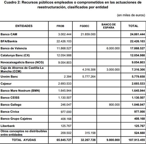 El siguiente cuadro resume la distribución de las ayudas por tipos de apoyo. El Fondo de Rescate bancario (FROB), de titularidad estatal, ha comprometido casi 66.000 millones, el Fondo de Garantía de Depósitos (FGDEC, formado por el conjunto de entidades financieras) algo más de 32.000 y el Banco de España casi 10.000 millones de euros.