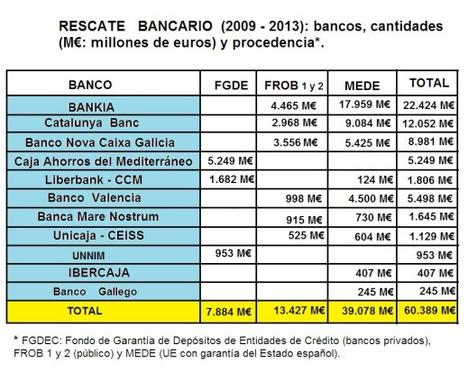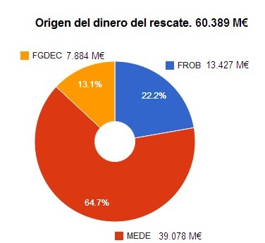 Pero, dentro de esta cifra, hay que descontar los 977 millones que devolvió Caixa Bank al quedarse con Banca Cívica, de modo que la factura queda reducida a un total de 60.389 millones. Y dentro de este importe, 7.884 millones de euros fueron aportados por los bancos a través del Fondo de Garantía de Depósitos, 13.427 salieron del FROB (Estado) y los 39.078 millones restantes del préstamo concedido por la UE al Estado español (a cargo también del contribuyente) mediante el Fondo de rescate europeo, tal y como detalla el blog Desde el exilio.