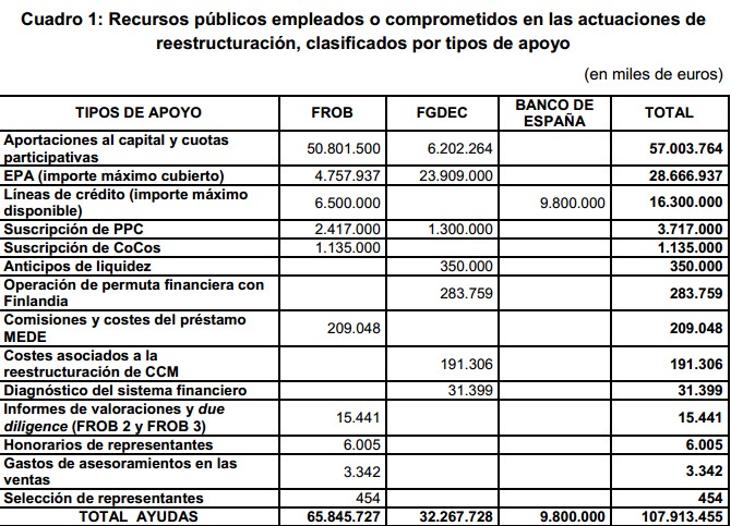 Según el Tribunal de Cuentas, "el importe de los recursos públicos empleados o comprometidos en la reestructuración, como consecuencia de las actuaciones realizadas entre 2009 y 2012, fue de 107.913 millones de euros". El problema, sin embargo, es que dicho importe incluye "conceptos de naturaleza muy diversa", según aclara el propio organismo, desde "costes y desembolsos de fondos" -como aportaciones de capital o la suscripción de participaciones preferentes- hasta "garantías constituidas que vencerán en el futuro" -esquemas de protección de activos (EPA)- o diferentes líneas de crédito.