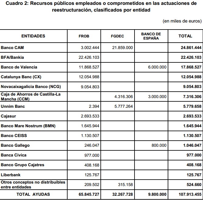 En este caso, el importe total asciende 57.000 millones, de los que casi 51.000 fueron aportados por el FROB (contribuyentes españoles) y los 6.000 restantes por otras entidades financieras privadas a través del FGDEC. Así pues, el propio Tribunal de Cuentas admite que el coste directo para el contribuyente es algo superior a los 50.000 millones de euros, por el momento.