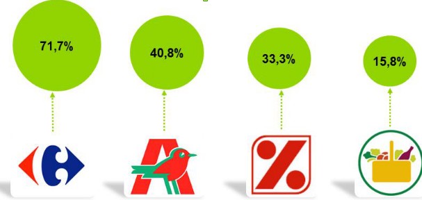 Pero, no todas las cadenas se comportan de la misma manera con las marcas del fabricante. En 2013, se lanzaron en España un total 128 productos considerados totalmente innovadores, el resto son derivados de los ya existentes. Esta cuantía supone un 13,5% menos que los productos novedosos creados el año anterior. Teniendo en cuenta a los big four de los supermercados, que ocupan el 60% del mercado, en el gráfico siguiente se observa el porcentaje del total de artículos innovadores que colocaron estas cadenas en sus estanterías el año pasado.