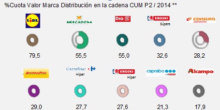 El experto no ha querido dar nombres, pero a continuación se puede observar el peso de la facturación que tiene la marca blanca en las cadenas más populares y se puede intuir con quienes están más molestos.