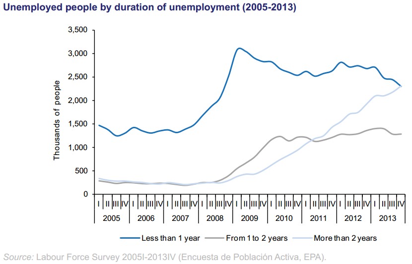 De todos los datos de la última EPA, publicada en enero, quizás el más preocupante fue uno que pasó desapercibido. Por primera vez, hay más parados eternos (si consideramos así a los que llevan más de dos años en situación de desempleo) que parados de corta duración (los que llevan menos de un año.