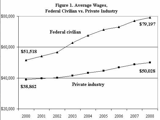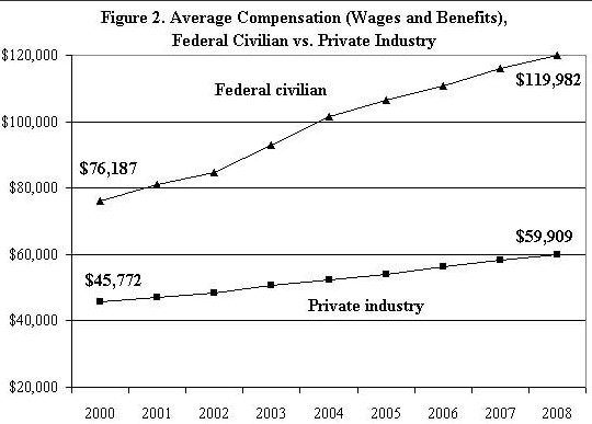 En el año 2000 el sector privado registraba un sueldo medio de $38.862 dólares frente a los $51.518 del sector público federal. Ocho años después, los burócratas de Washington ganaban, de media, $79.197 dólares. Mientras tanto, los trabajadores del sector privado tenían un ingreso anual medio de $50.028 dólares.