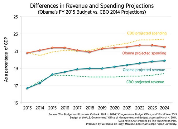 La discrepancia también llega cuando analizamos el gasto. Según los estudios de la Oficina Presupuestaria del Congreso, el gasto crecerá durante el resto de la Presidencia de Obama y seguirá aumentando también en los años que siguen. Así, los desembolsos crecerán de menos del 21% a más del 22% del PIB.