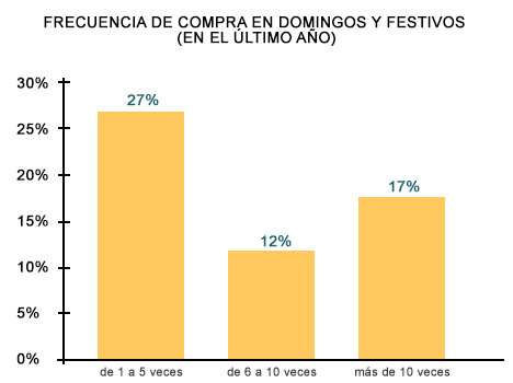 El cambio de normativa ha modificado los hábitos de compra de casi 2,8 millones de madrileños, el 43% de la población. En el último año, el 56,2% de los encuestados admite haber comprado sus productos habituales en domingos y festivos. La amplia mayoría, el 89% de ellos, asegura que ha realizado sus compras en medianas y grandes superficies frente al 44% que ha optado por el comercio de proximidad.