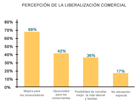 Respecto a la percepción que los madrileños tienen de la liberalización comercial, un 68% cree que ha supuesto una mejora para los consumidores; un 42% la considera una oportunidad para los comerciantes; y para un 17%, mayores de 65 años y amas de casa con mayor disponibilidad para comprar el resto de días de la semana, no ha tenido una afectación especial.