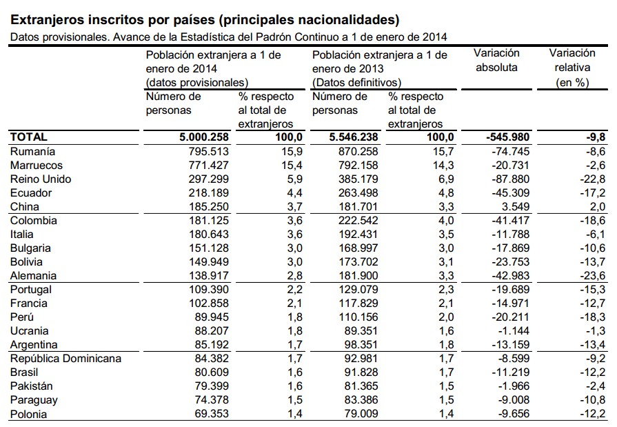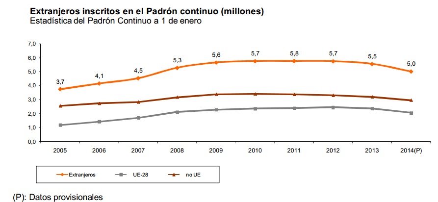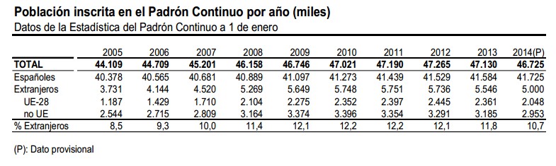Dicha caída se debe a la pérdida de población extranjera, según los datos del INE. De la cifra total, 41.724.906 personas son de nacionalidad española y 5.000.258 extranjeros (el 10,7% de inscritos). De este modo, mientras el número neto de españoles no ha dejado de aumentar, el de extranjeros ha bajado en los tres últimos años. Desde el 1 de enero de 2011, el volumen de extranjeros cayó en 751.000 personas como consecuencia de la crisis, equivalente al 13% del total de residentes foráneos.