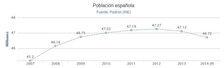 Desde que en 1998 se comenzó a elaborar este indicador, la población empadronada creció todos los años hasta el cierre de 2011, momento en el que alcanzó un récord histórico de 47.265.000 residentes. Sin embargo, a partir de ahí la población comenzó a descender. Así, España perdió un total de 540.000 habitantes entre 2012 y 2013 (-1,1%) y, más concretamente, 404.619 personas en el último año.