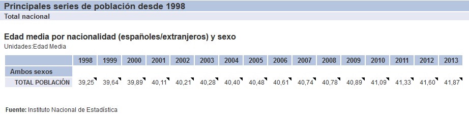 En la actualidad, la edad media de la población es de 42,2 años (43 en el caso de los españoles y 34,9 los extranjeros). España, por tanto, ha envejecido 2,6 años desde 1998, momento en el el Instituto Nacional de Estadística (INE) comenzó a elaborar el Padrón Continuo. Sin embargo, dicho envejecimiento se ha acelerado de forma sustancial en los últimos tres años, ya que la edad media ha avanzado casi 0,8 años desde 2010.
