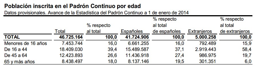 España no sólo está perdiendo población sino que, además, acelera su ritmo de envejecimiento demográfico. El país contaba con un total de 46,7 millones de habitantes a 1 de enero de 2014, unas 540.000 personas menos que dos años antes, debido al éxodo que está registrando la población extranjera como consecuencia de la crisis.