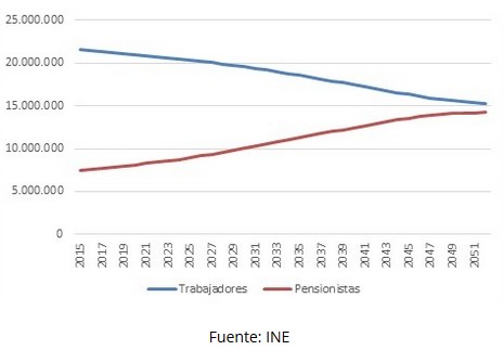 El siguiente gráfico resume la compleja situación que registrará el sistema público de pensiones en las próximas décadas.
