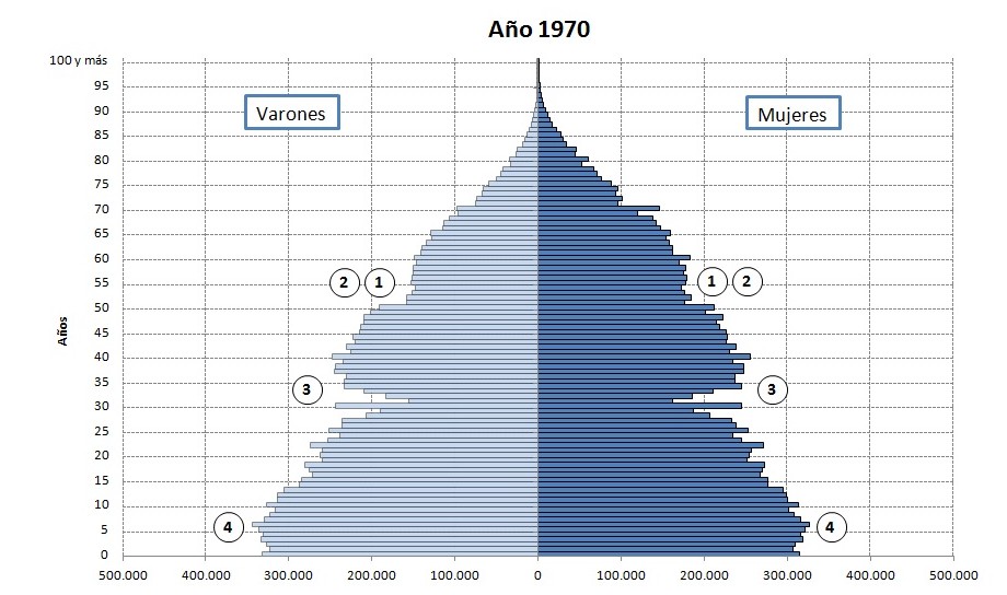 Las siguientes figuras reflejan la pirámide poblacional de España en las últimas décadas, tal y como recoge el blog Apuntes de Demografía. En los 70, la forma de la pirámide combinaba un descenso en la mortalidad infantil y el inicio del baby-boom (4), con cifras de nacimientos anuales superiores a 650.000 entre 1958-1977. Las huellas de la guerra civil son claramente visibles (pérdidas militares y déficit de nacimientos).