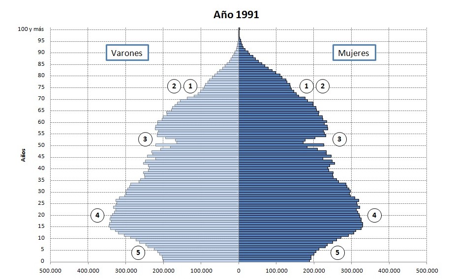 En 1991, la huella del baby-boom es más destacable por la profunda depresión de los nacimientos posterior a esas fechas, una caída intensa, acelerada y sostenida en el tiempo (5).
