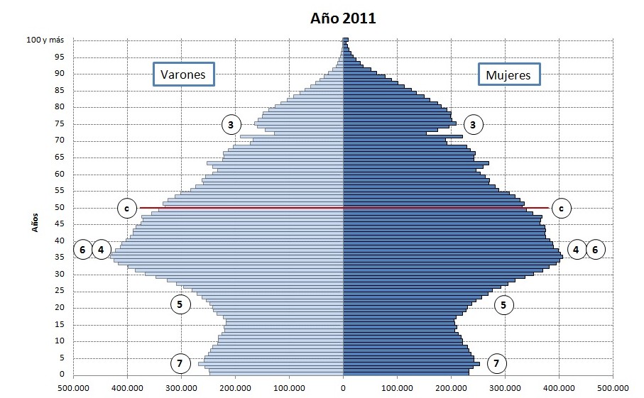 Por último, en la pirámide de 2011 se observa cómo las generaciones más reducidas de la guerra civil alcanzan la vejez. Asimismo, una fuerte inmigración con edades similares a las cohortes del baby-boom aumenta ostensiblemente el tamaño de los escalones entre 35 y 55 años (6); repuntan los nacimientos (7), esbozo de una tendencia que parece detenerse o incluso retrocede debido a la crisis económica que se inicia en 2008, y que, muy posiblemente, continuará en los próximos años.