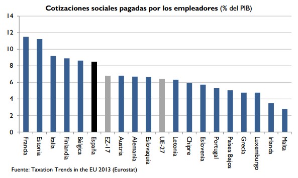 Además, el informe destaca que las cotizaciones que pagan los empresarios españoles por sus empleados "son relativamente elevadas en relación con nuestros socios de la Eurozona". Y es que, según los datos de Eurostat, España es el sexto país de la Unión Europea (UE) con las cotizaciones sociales más altas de la Eurozona en porcentaje del PIB. Sólo por Francia, Estonia, Italia, Finlandia y Bélgica superan a nuestro país. En España, las cotizaciones sociales pagadas por las empresas suponen el 8,5% del PIB, cifra superior a la media de la Eurozona y del conjunto de la UE que se sitúan en el 6,8 y el 6,4% del PIB, respectivamente.