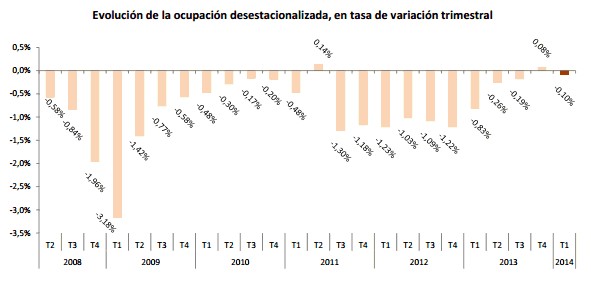 El número de ocupados baja en 184.600 personas respecto al cuarto trimestre de 2013 (-1,08%), hasta situarse en un total de 16.950.600. Se trata de la menor destrucción laboral en un primer trimestre desde 2008. Asimismo, a nivel interanual, han desaparecido un total de 79.600 puestos de trabajo (0,47%), la menos negativa desde el segundo trimestre de 2008.