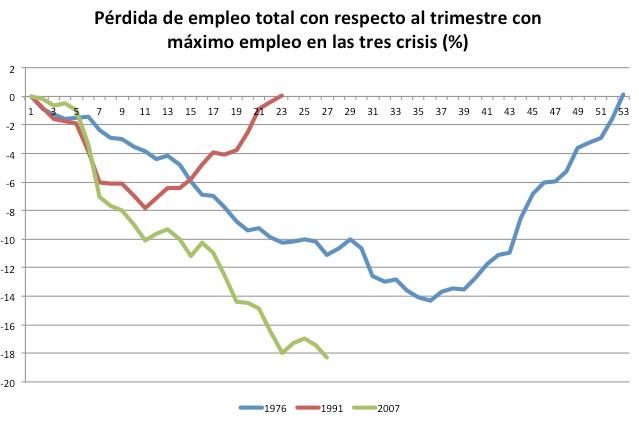Pese a ello, cabe tener muy en cuenta el brutal deterioro laboral que ha experimentado España. Así, la crisis se ha llevado por delante unos 3,8 millones de empleos, ya que la ocupación ha bajado desde los 20,75 millones en el tercer trimestre de 2007 hasta los 16,95 actuales, el menor volumen desde 2002. Esto supone perder casi el 19% del empleo total, tal y como muestra el siguiente gráfico elaborado por el blog Nada es Gratis, la mayor destrucción laboral de la historia reciente de España, muy superior a la crisis de los años 90 y 70.