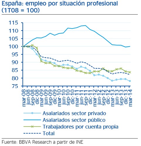 En la actualidad, el sector público cuenta con un total de 2.920.500 asalariados. De hecho, el empleo público ha crecido por primera vez desde el segundo trimestre de 2011, tras subir en 11.100 ocupados. El sector privado, por el contrario, ha destruido 175.100 empleos en el primer trimestre de 2014.